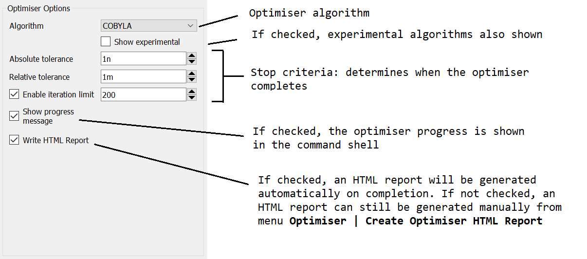 | Iteration limit | If enabled, the optimiser will complete when the specified number of iterations is reached |