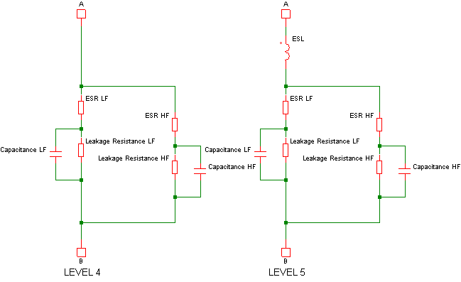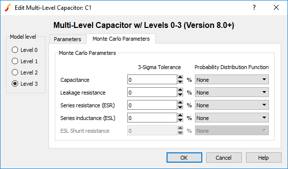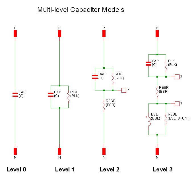 The Multi-Level Capacitor has four model levels. As the level increases, additional parasitic circuit elements are added. This capacitor, available with Version 8.0 or later, is used to model a wide variety of capacitor types where the number and type of parasitic circuit elements can be configured.
