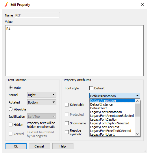 Property fonts are overrides to the standard font used for properties within a symbol instance. Any style can be added to the available property fonts by selecting the Include as Property Font checkbox. Checking this on a local style will make the style available to only properties within that schematic, whilst checking it on a global style will make it available to all schematics.