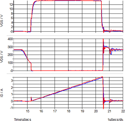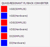 By including PWL capacitors to model the non-linear capacitances of the MOSFET, SIMPLIS can also do a good job of modeling the device switching transitions. This example is from a Quasi-Resonant Flyback Converter used in an AC adapter application. The main MOSFET and output rectifiers in the example were automatically converted from the SPICE models with the Model Parameter Extraction algorithms. The resulting SIMPLIS model correlates well to the hardware measurements of the gate-to-source voltage, drain-to-source voltage and drain current.