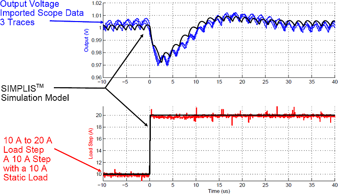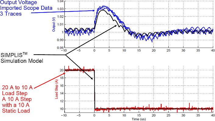 This example comes from a single-phase, digitally-controlled, synchronous Buck converter. These oscilloscope images of the output voltage and output current were taken with three triggers of the hardware measurement. The SIMPLIS simulation results were overlaid on the hardware data. The maximum error during both a step load increase and step load decrease is 0.5%.