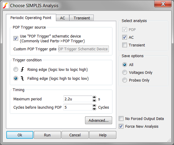 The Periodic Operating Point (POP) analysis is one of the most powerful capabilities of SIMPLIS. The POP analysis is a specialized transient analysis which quickly finds the switching steady-state operating point of a circuit. Once the steady-state operating point is found, an AC analysis at the periodic operating point can be performed on the circuit.