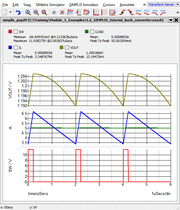 Armed with this information, POP then simulates the circuit for another switching cycle. POP then re-samples the capacitor voltages and inductor currents, and makes a calculation to determine if the values are essentially the same from one switching edge to the next switching edge. If the percent error is less than the POP convergence specification, the POP algorithm decides the converter is in steady state and exits. The simulation time is reset to zero, and a user specified number of switching cycles, three in this case, are simulated and plotted on the waveform viewer.
