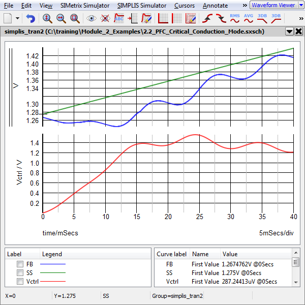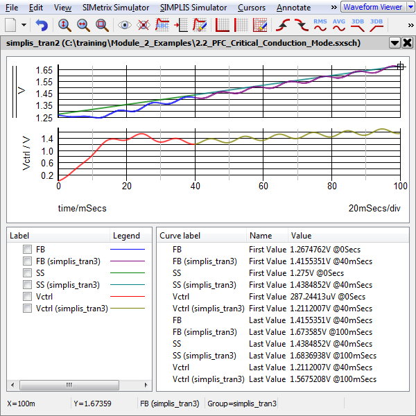 Now you will tell SIMPLIS to load the state of the PFC circuit at 40ms, and continue to simulate for another 60ms to the stop time of 100ms.