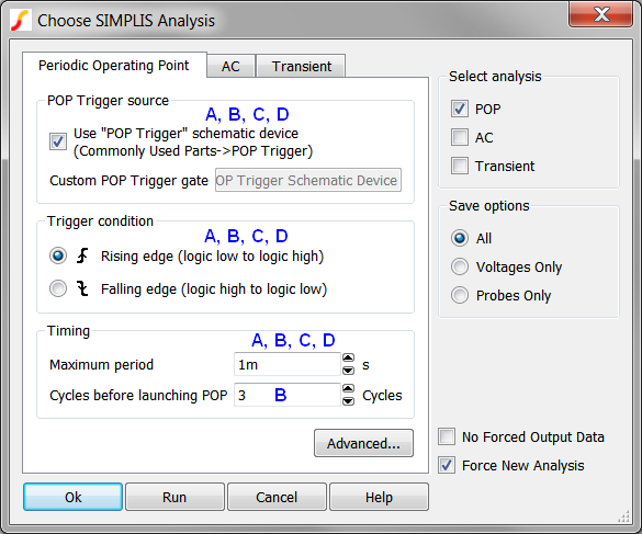 The parameters which control a POP analysis are entered on the Simulator > Choose Analysis... dialog. The dialog for the 2.7_SelfOscillatingConverter_POP.sxsch design is shown below, with the controls used for each phase of the POP analysis labeled A, B, C and D.