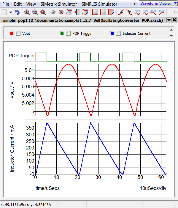 Result: The POP analysis runs and 3 cycles of the POP Trigger, Output Voltage and Inductor Current are output to the waveform viewer.