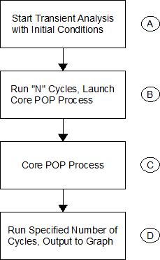 The periodic operating point (POP) analysis you just ran is unlike any other analysis. POP is actually a sequence of transient simulations, run back to back, where the initial conditions are adjusted and refined between each run. From a high level view, POP can be broken into four major phases, labeled A-D in the flow chart image below: