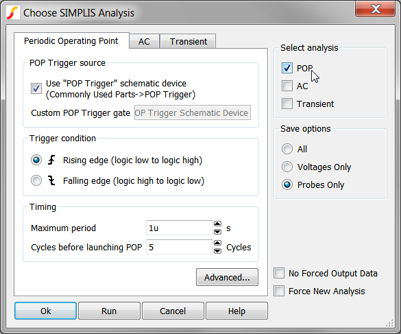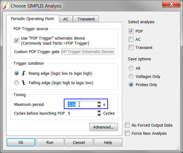 • SIMPLIS needs to know the maximum period for your circuit. Therefore an incorrect Maximum period parameter will cause POP to fail.
