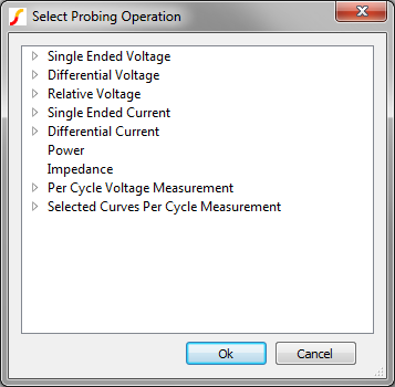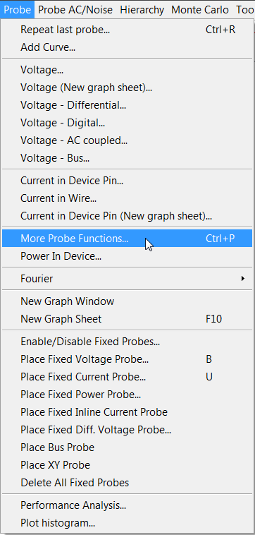 In section 2.3 Managing Simulation Data, you used random probing to plot a voltage. In the Getting Started section of this topic, you randomly probed a pin current. The most often used random probe functions are listed on the schematic menus Probe, and Probe AC/Noise. The advanced probe functions are located on the schematic menu Probe ▶ More Probe Functions... menu: