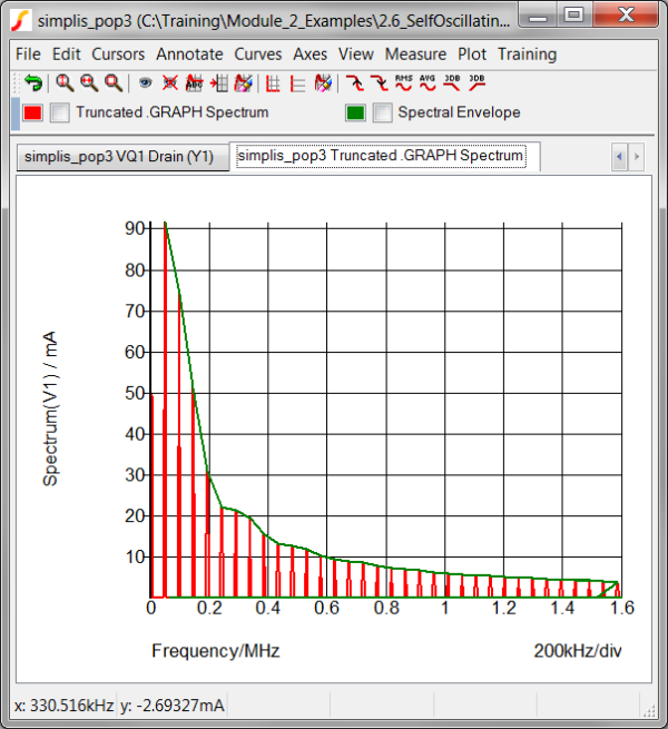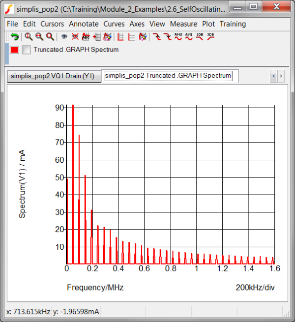 Result: The POP simulation executes and the frequency spectrum of the current in V1 is automatically plotted on the waveform viewer: