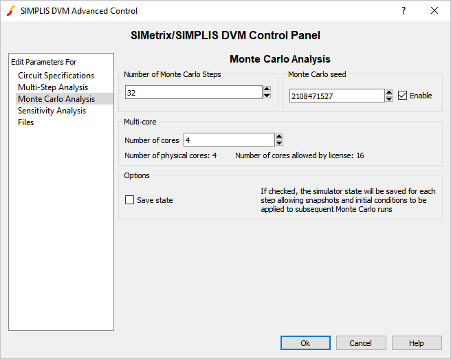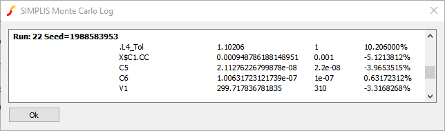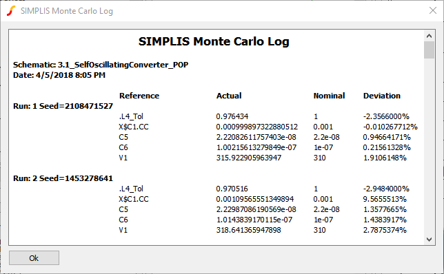 The SIMPLIS Monte Carlo Analysis is similar to the SIMPLIS Multi-Step Analysis except instead of stepping a parameter, the Monte Carlo seed value is stepped. The seed value is used to determine the values of each statistical distribution function used in the design. If no statistical distribution functions are used in the circuit, each seed value will produce identical simulation results.