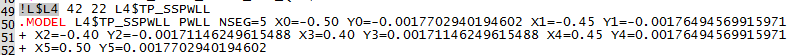 Piecewise Linear Inductors, such as L4 in this example, are implemented with a .MODEL statement, which in this case, starts on line #50. The PWL points are listed as X,Y pairs starting at X0 and Y0. Notice the X values have the same numerical values defined in the dialog. The Y-values are all multiplied by the constant value L4_Tol. The L4_Tol is constant because the value is evaluated once per Monte Carlo run, and from that point onwards, the same constant value is used in the expressions for L4_Tol. The value of L4_Tol will almost certainly be different for the next Monte Carlo simulation step.