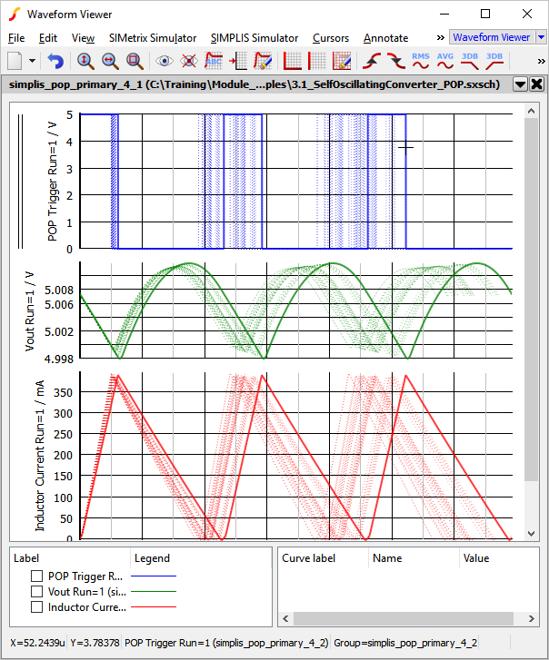 Note the seed value 1988583953 which was used for this run. In this converter, the switching frequency is highly dependent on the inductance value. Not unexpectedly, the evaluated parameter value for the inductance is higher than the default value, which requires longer charging and discharging times, and hence a lower switching frequency results.