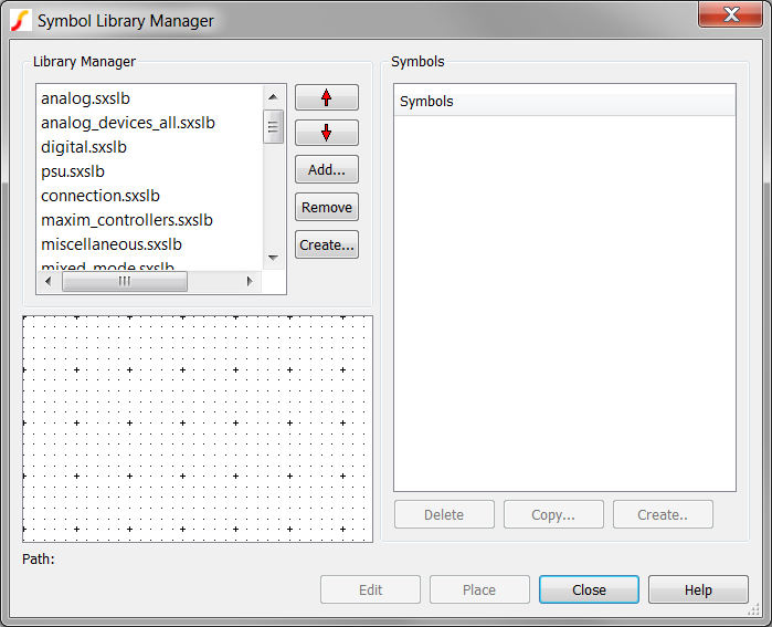 With this dialog, you can determine which libraries contain which symbols and add, remove, or create symbol libraries. The Help button links to a comprehensive help topic on the use of the Symbol Manager.