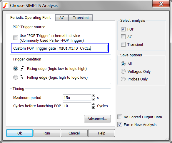 • The POP Trigger gate can be inside the ASCII or encrypted ASCII model. You can explicitly define the POP trigger gate on the Choose SIMPLIS Analysis dialog.