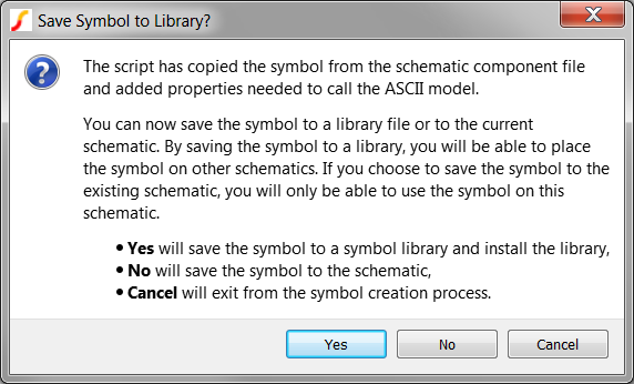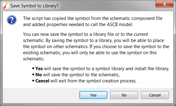Result: As in the first exercise, the ASCII model libraries and the symbol are created. TThe same dialog opens, and you will want to click Yes.
