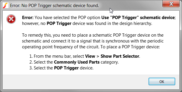 Result: The simulation fails because the design has no POP Trigger schematic device. In the process of converting the LLC Modulator block to an ASCII model, the schematic POP Trigger device was also converted to ASCII text. As a result, the program cannot find the POP Trigger schematic device (a symbol) and the following error message opens: