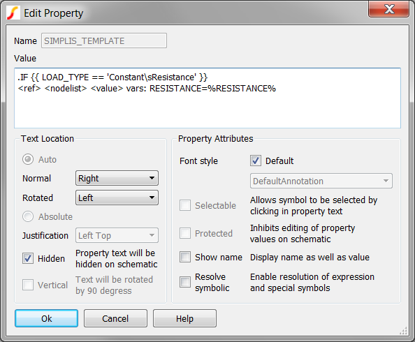 It is also important to remember that the SIMPLIS_TEMPLATE literally defines the netlist entry for a symbol. As such, you need to be very careful when editing the SIMPLIS_TEMPLATE property. In the above example, the SIMPLIS_TEMPLATE is spread out on three lines, and this is critical to the conditional expression evaluating correctly.