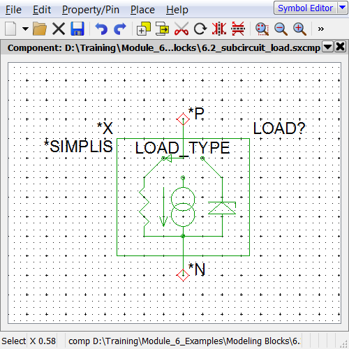 Now that the model and associated symbol are completed, its time to start testing. A testbench schematic for the complete subcircuit load is located in the Module_6_Examples directory. The testbench has test circuitry for each load type, so you will need to place three loads on the testbench schematic. After you place each load you should configure each of the three symbols to use one of each load type. The testbench schematic is located at: C:\Training\Module_6_Examples\6.4_test_subcircuit_load.sxsch.