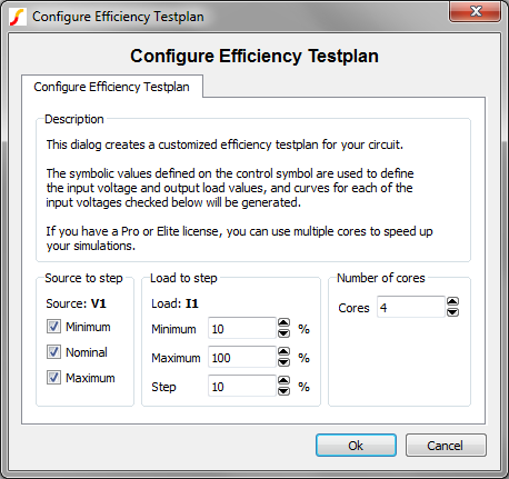 load current in percent (I1_VALUE) times the nominal, full load current (5A.) Alias(Efficiency,Efficiency_%V1_VALUE%)This Alias() entry creates groups of scalars based on the stepped input voltage value. How this works is relatively simple - after the multi-step simulation runs, there are 30 measured scalar values for the converter efficiency - each one with the same name: Efficiency. What this alias entry does is take these scalar values and make duplicates with the %V1_VALUE% text replaced with the actual stepped parameter value for V1_VALUE. In this example, the input voltage is stepped over three values and the following scalars are aliased:
