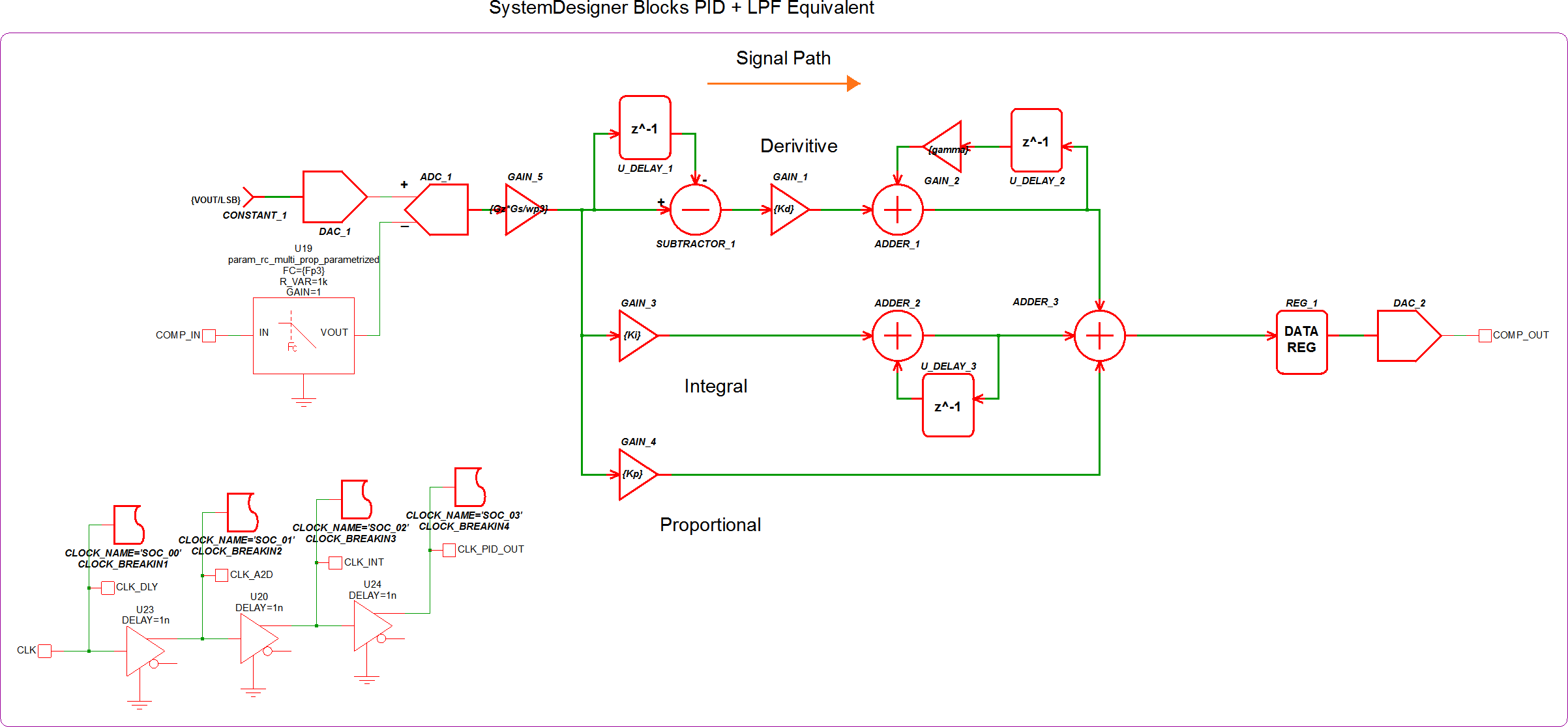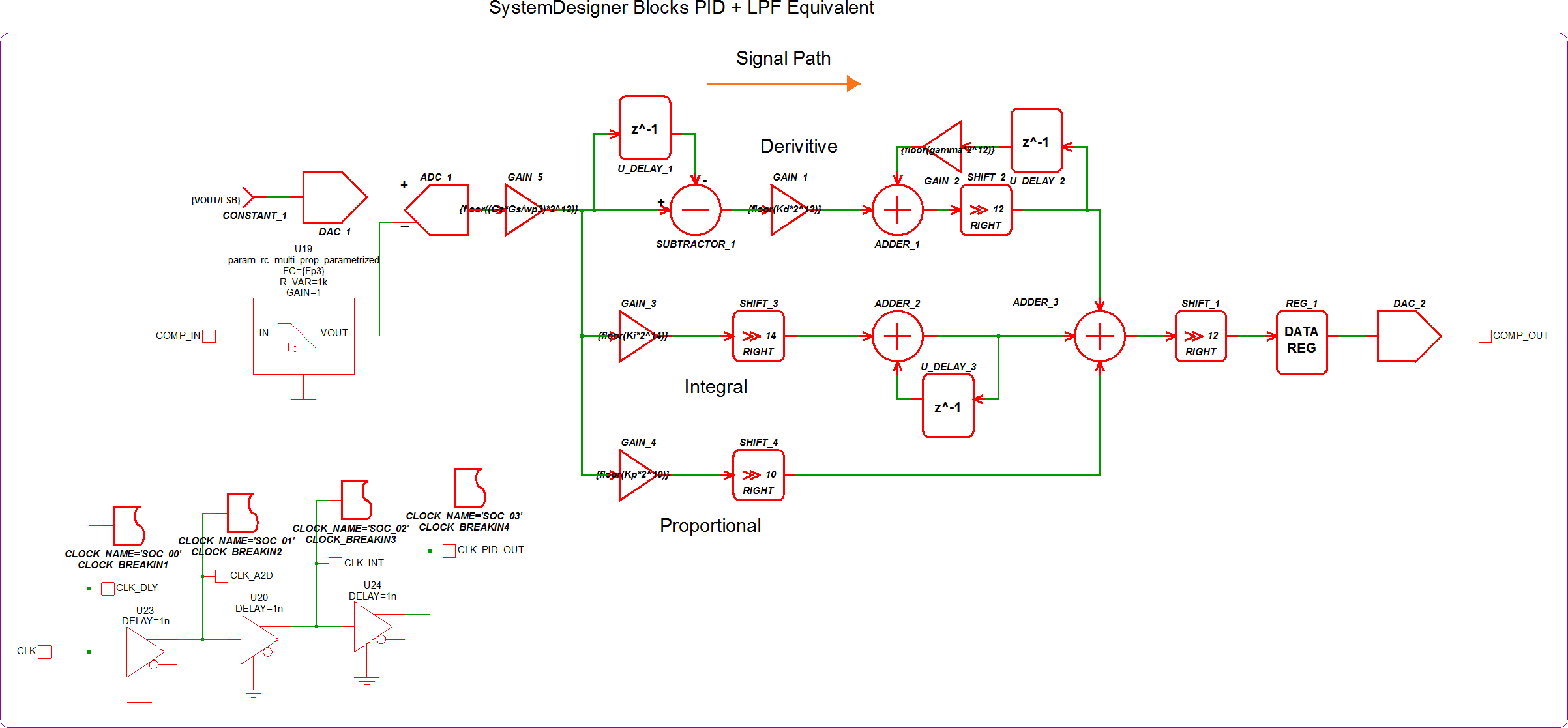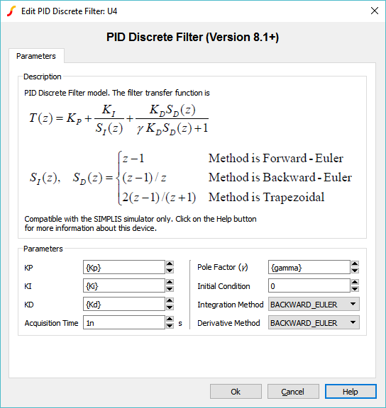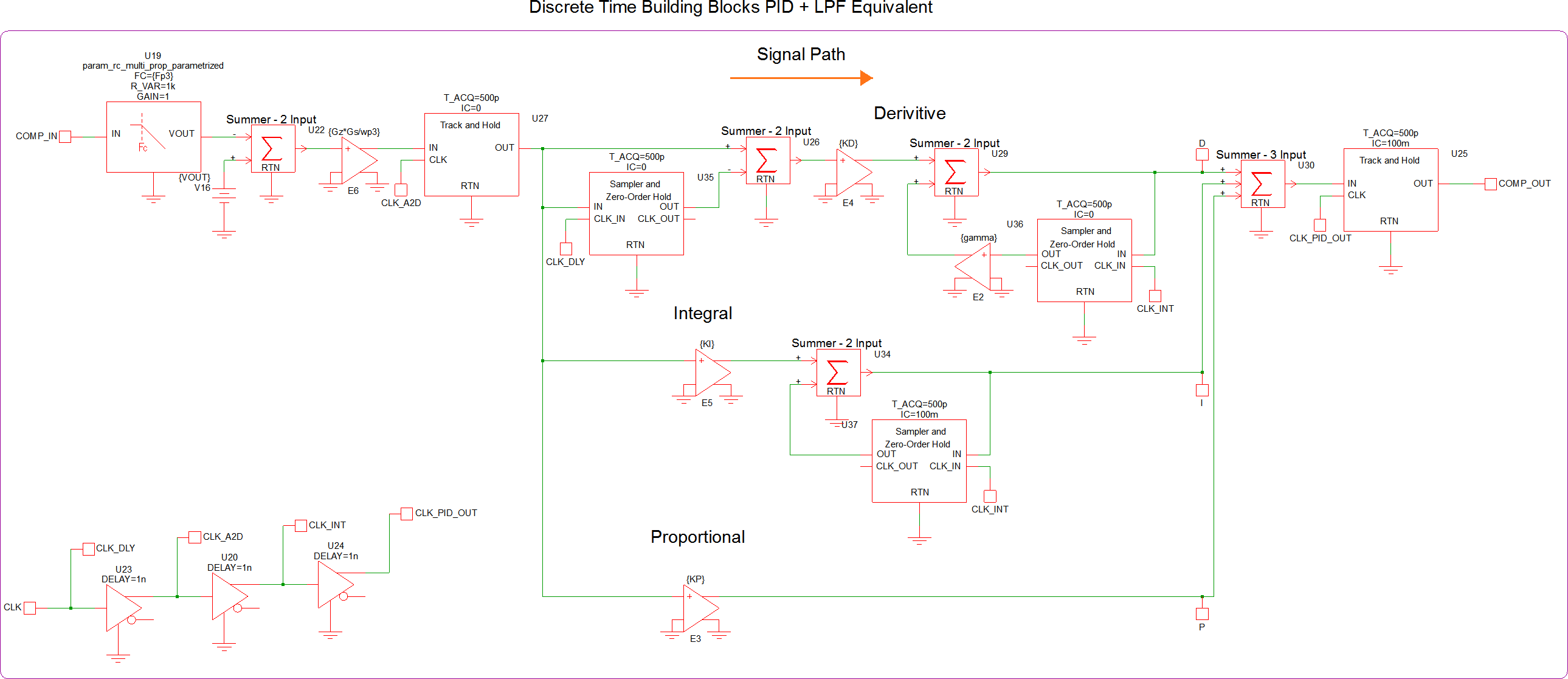 SIMetrix/SIMPLIS provides users the ability to model their digital components in a variety of ways. The four ways of modeling a digital component are by using digital hardware, discrete-time filters, SystemDesigner devices, and Verilog-HDL. This topic describes how to convert an existing analog compensator to a digital PID compensator using both discrete-time filters and SystemDesigner devices.