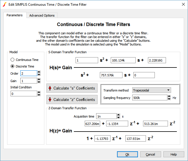 Using these calculations, copy and paste the numerator and denominator coefficients into the Continuous or Discrete Time Filter model dialog as shown below. The sampling frequency and acquistion time need to be also set before the "z" coefficients are calculated.