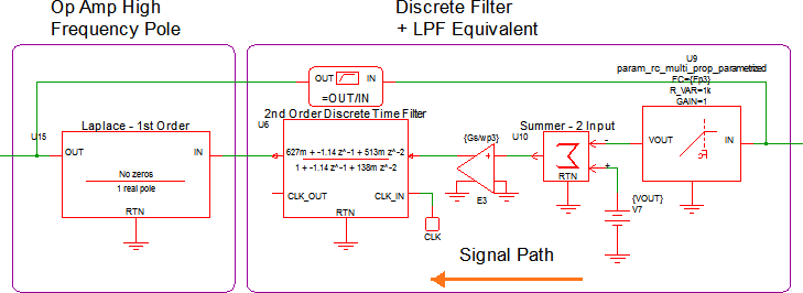 The first objective in step 5 is to switch out all of the discrete time components with their SystemDesigner equivalents and prepare the circuit to simulate with Double Precision Floating Point math. This simulation will allow you to run an AC analysis and check the accuracy of your circuit. The circuit in apps_e_step_5a_sd_pid_filter.sxsch is set up to run an AC analysis with the following SystemDesigner PID implimentation:
