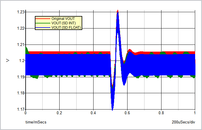 A final comparison is the Transient simulation. In the image below, you can see the red waveform is the original output voltage, the green waveform is the SystemDesigner Signed Integer mode output voltage, and the blue waveform is the SystemDesigner Double Precision Floating Point mode output voltage.