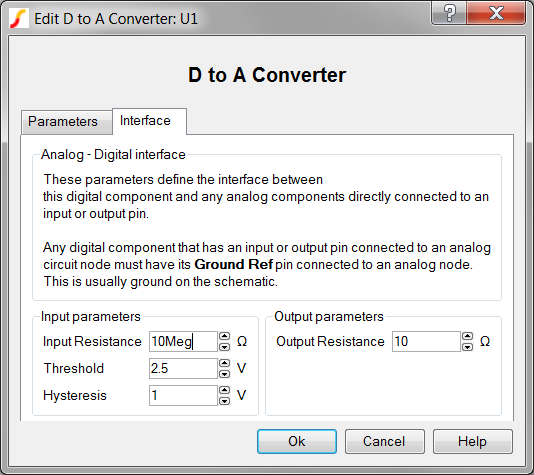 To define the parameters for the interface between this digital component and each analog component connected directly to an input or output pin, follow these steps: