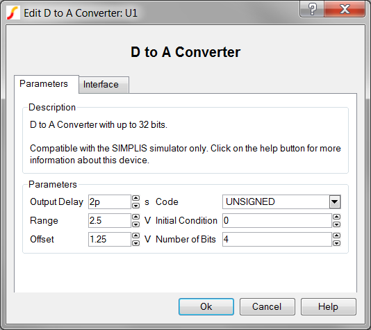 Because the Digital to Analog Converter model is generated by a template script when the simulation is executed, a hand-coded model cannot be inserted into a netlist. The template script for this device is simplis_make_a2d_model.sxscr, which licensed users can download as part of a zip archive of all built-in scripts.