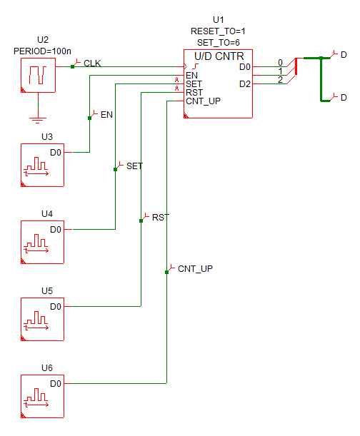 The Up/Down Counter models a generic up or down counter with between 2 and 32 output bits. The direction of the counter is based on the CNT_UP pin.