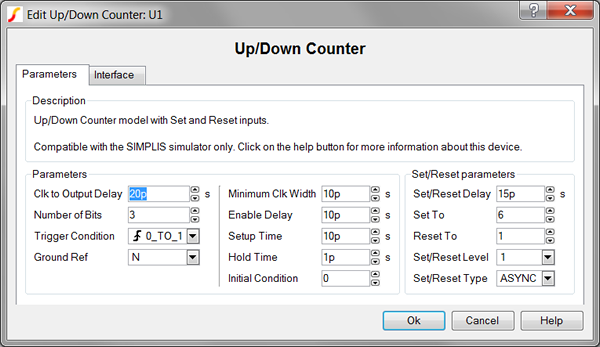 Because the Up/Down Counter model is generated by a template script when the simulation is executed, a hand-coded model cannot be inserted into a netlist. The template script for this device is simplis_make_counter_model.sxscr, which licensed users can download as part of a zip archive of all built-in scripts.