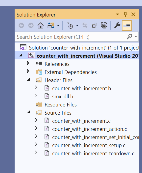 Expand the Solution Explorer window to show the source and header files that are a part of the project.