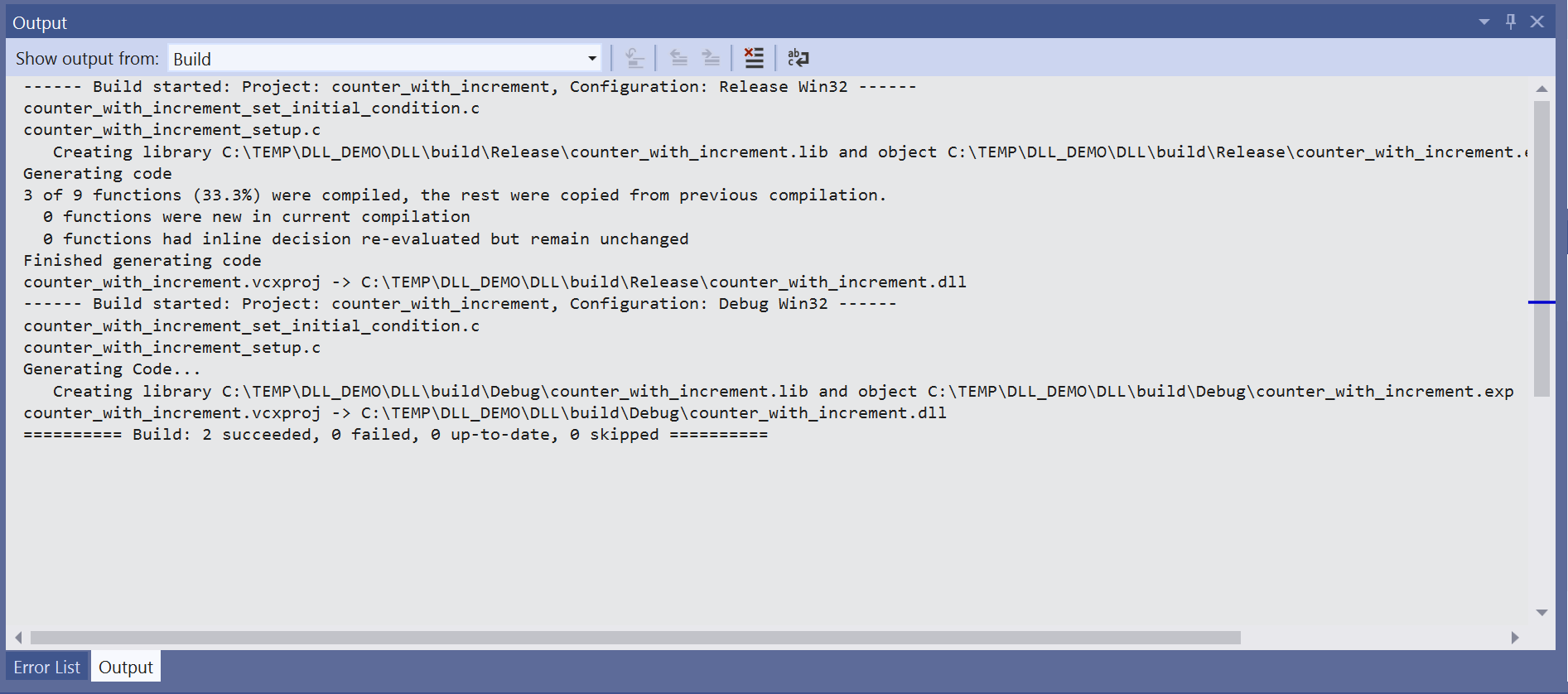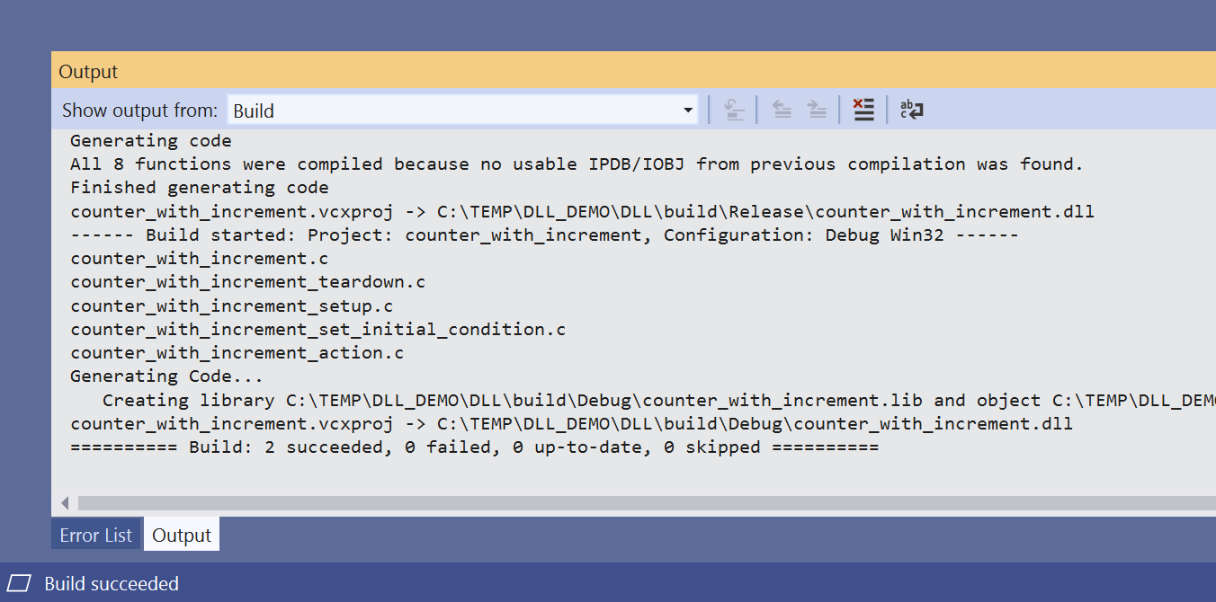 When the build successfully completes, Visual Studio's console will show that both the "Debug" and "Release" .dll files have been created.