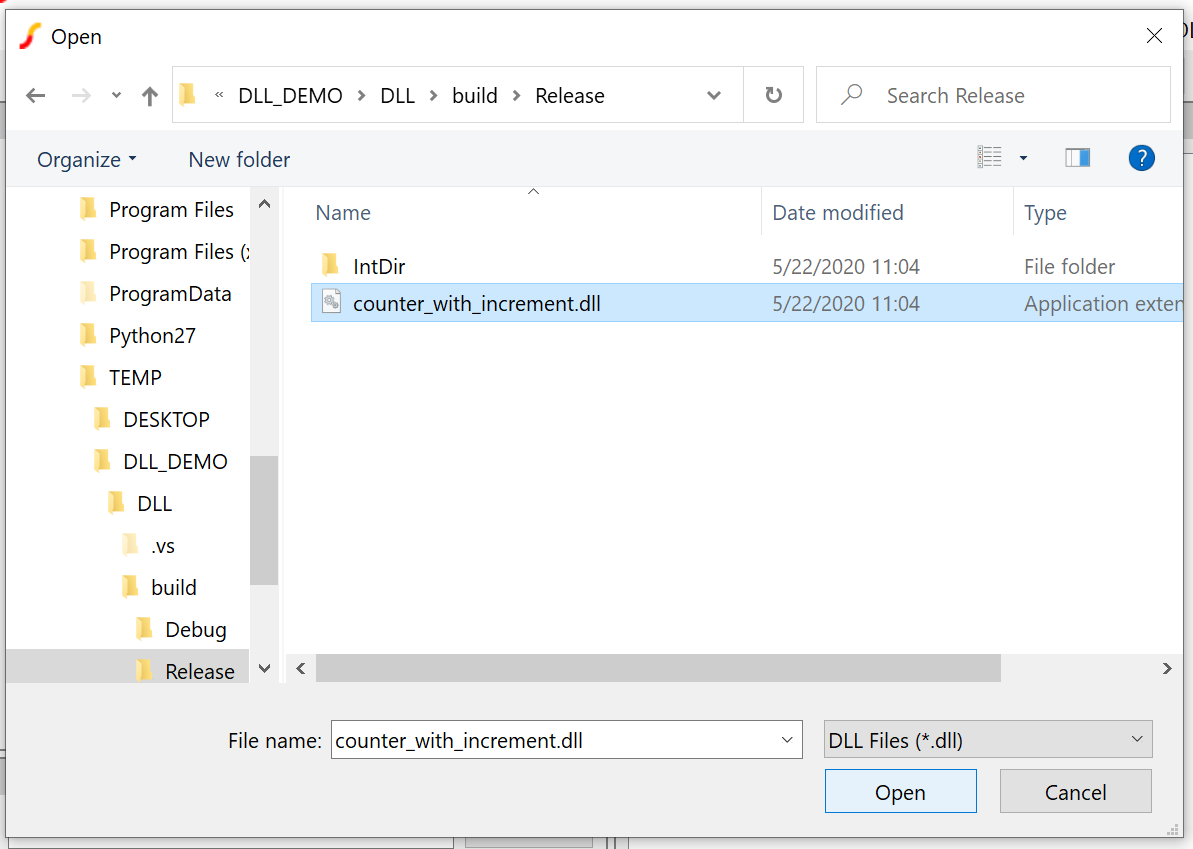 Using the resulting file selection dialog, select the newly built "Release" .dll file found in the "build/Release" directory and hit "Open".