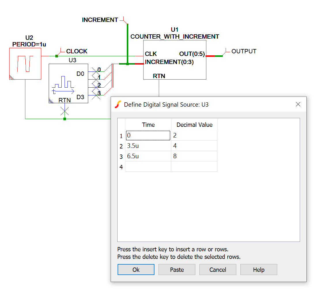 To test our device, add a digital pulse source with a PERIOD of 1u, PULSE_WIDTH of 500n and a START_DELAY of 250n. Wire up a 4 bit digital signal source to the INCREMENT bus of the DLL-defined Digital Device.