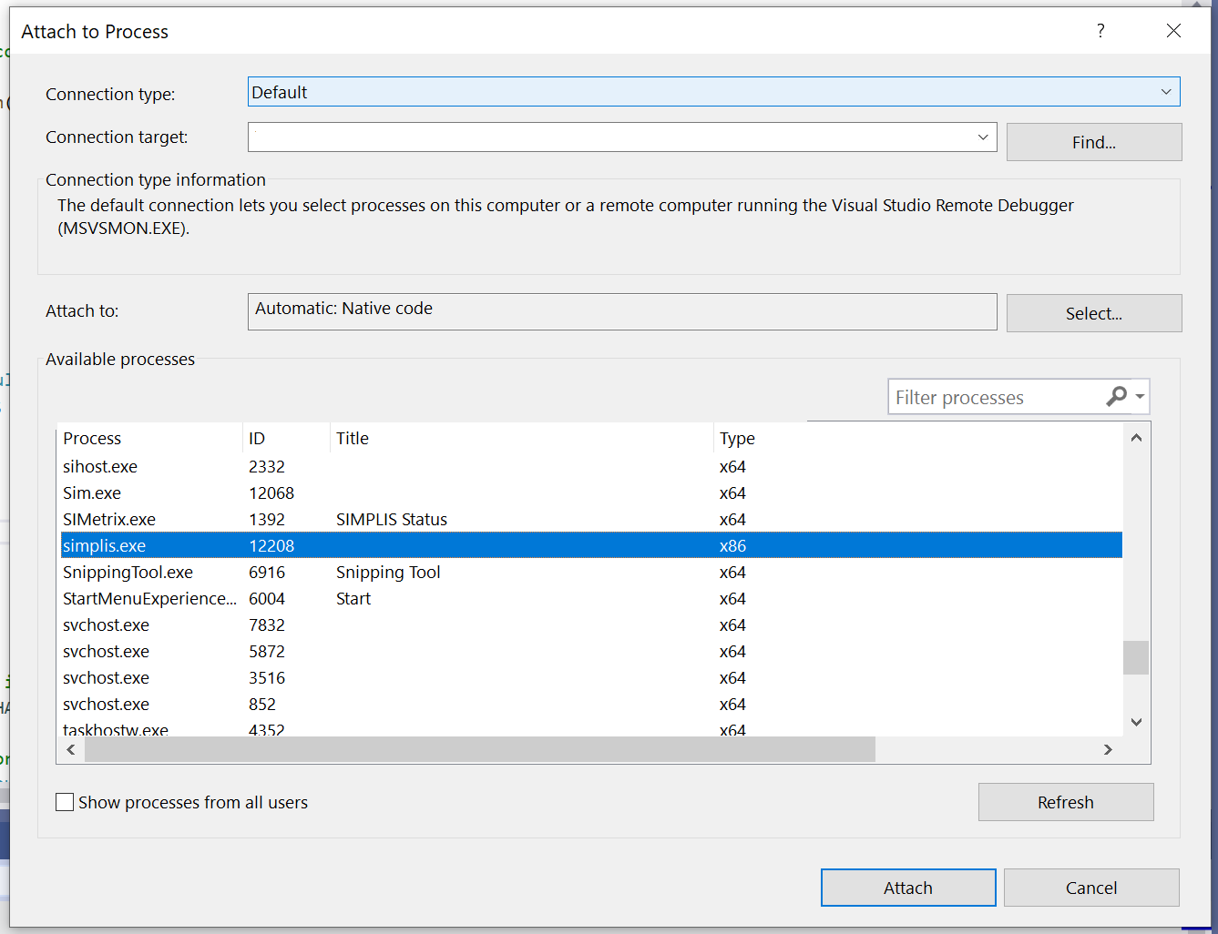 While SIMPLIS is paused, switch focus to Visual Studio. From the menu, choose Debug | Attach to Process... When presented with the list of running processes, choose simplis.exe and click "Attach". Once attached, you can step through the code line by line, or run up until any arbitrary breakpoint you set.