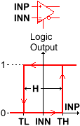 Hysteresis The Hysteresis (H) of the comparator. To determine the actual threshold (TL, TH), substitute Hysteresis (HYSTWD) in each of the following formulas, where INN is the negative input pin voltage. The comparator output voltage will change state when INP, the positive input pin voltage, reaches TL or TH :