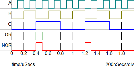The waveforms below were taken from a 3-input OR/NOR gate with two active-high inputs and one active-low input. The two active-high inputs are labelled A and B, and the active-low input is labelled C. With this configuration, the OR output will be high when either of the A and B inputs are high or the C input is low.