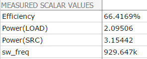 A number of scalar measurements which DVM automatically makes require knowledge of the actual switching frequency of the converter. In particular, the test objectives listed below measure the output voltage and current at the end of the simulation time. These in-regulation measurements require DVM to know the actual converter switching frequency and without this information, the in-regulation measurements are not made. For this reason, a special curve name,  DVM Frequency, has been reserved for DVM to find the switching frequency.
