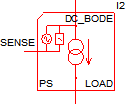 The Bode Plot Load - DC Current subcircuit models a dc current load with the AC small signal source and Bode plot probe that is required to generate Bode plots. This load is identical to the Bode Plot Load - Resistive Load, except this load uses a DC current to load the power converter. In DVM, the BodePlot() Test Objective uses the resistive Bode Plot Load - Resistive Load, you can use the SubCkt() Function in conjunction with the BodePlot test objective to generate Bode Plots with this load. See the Testplan Entry section for testplan details.