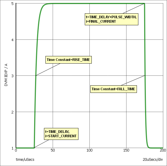 Exp(REF, START_CURRENT, FINAL_CURRENT, TIME_DELAY, RISING_TAU, PULSE_WIDTH, FALLING_TAU) Exp(REF, START_CURRENT, FINAL_CURRENT, TIME_DELAY, RISING_TAU, PULSE_WIDTH, FALLING_TAU, OPTIONAL_PARAMETER_STRING)