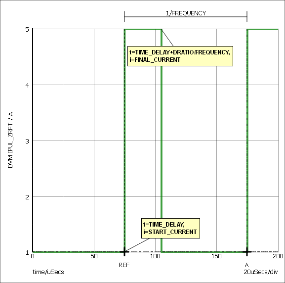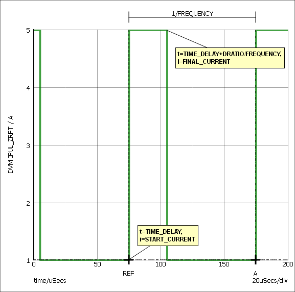 Since the TIME_DELAY parameter is set to zero, the pulse waveform begins with the FINAL_CURRENT value of 5A at t=0.