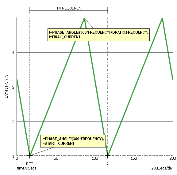 In this example the PHASE_ANGLE parameter is set to 60, and the OFF_UNTIL_DELAY is set to 1; therefore, for simulation times less than the time delay defined by the PHASE_ANGLE parameter, the load current is 1A, which is the value of the START_CURRENT argument.