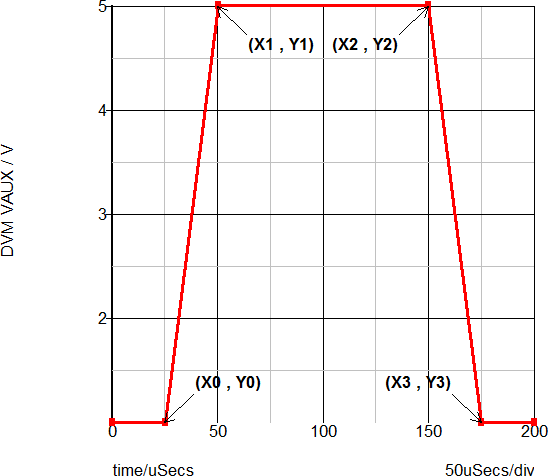 Pulse(V5, 1, 5, 1, TIME_DELAY=25u RISE_TIME=25u PULSE_WIDTH=100u FALL_TIME=25u)