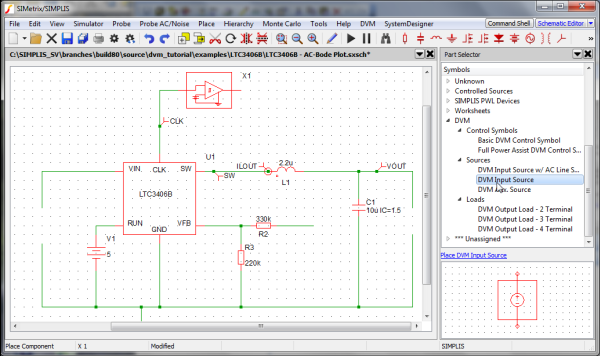 2. To open the schematic, double click the LTC3406B-AC-Bode Plot.sxsch file or drag that file into the SIMetrix/SIMPLIS Command Shell.