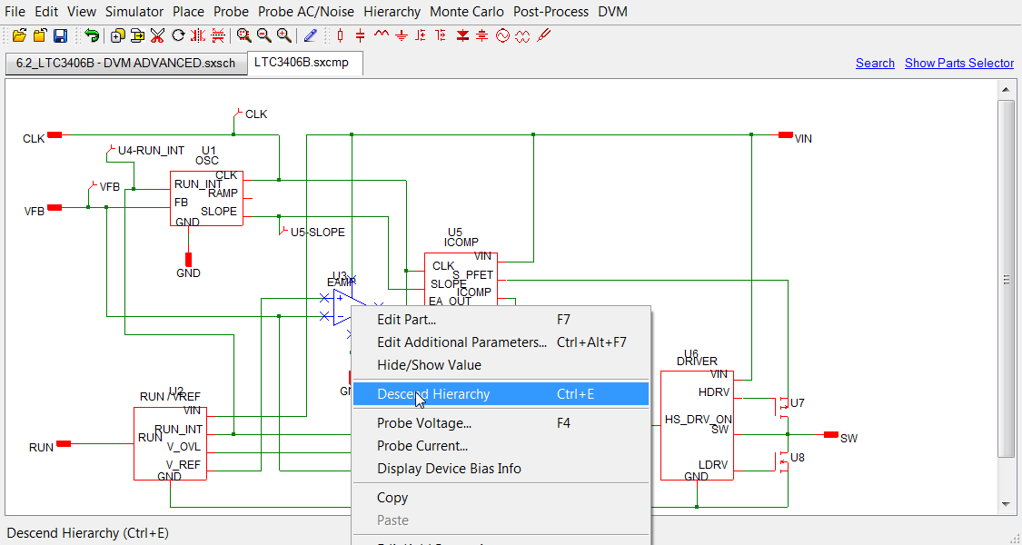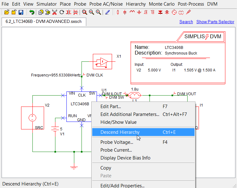 When this testplan is run on the schematic LTC3406B/6.2_LTC3406B - DVM ADVANCED.sxsch from SIMPLIS_dvm_tutorial_examples.zip , DVM descends for each test into U1, then into U3 and changes the component value for C2. The program then ascends to the top level and executes the simulation.