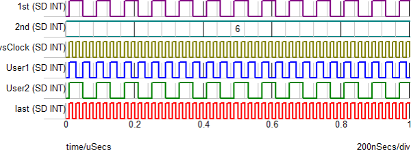 In clocks_example.sxsch, two global clocks have been exposed through the SystemDesigner Global Clock Breakout devices, and connected to regular voltage probes. A SystemDesigner Constant has also been placed on the schematic, and a SystemDesigner bus probe has been added to plot the constant value. Each probe has been assigned a Display order string of a, b, or z.