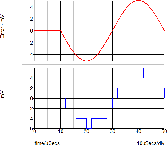During integer-sampled data simulations, the sine wave voltage is sampled by the ADC and quantized into BIN_SIZE amplitude values. The BIN_SIZE is set to 2mV with a variable in the F11 window of the schematic. The quantized amplitude of the data signal has a maximum value of 3 LSB counts. The output signal is probed with the SystemDesigner probe labeled Data. The DAC then converts the Data value to an analog voltage. Because the gains of the ADC and the DAC are identical, the sampled voltage at the Data bus and the DAC output differ only by a propagation delay.