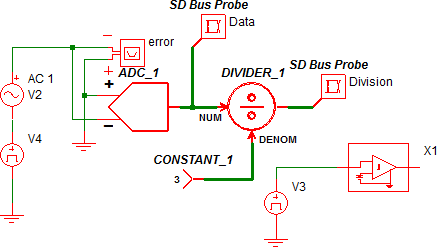 No model exists for a divider when simulating the double-precision floating-point sampled data. As with this example, dividers are most often used to gain signals. For this application, the SystemDesigner Gain device can be used. If your circuit requires scaling gain values, you can multiplex different gain values using the SystemDesigner Mux devices.
